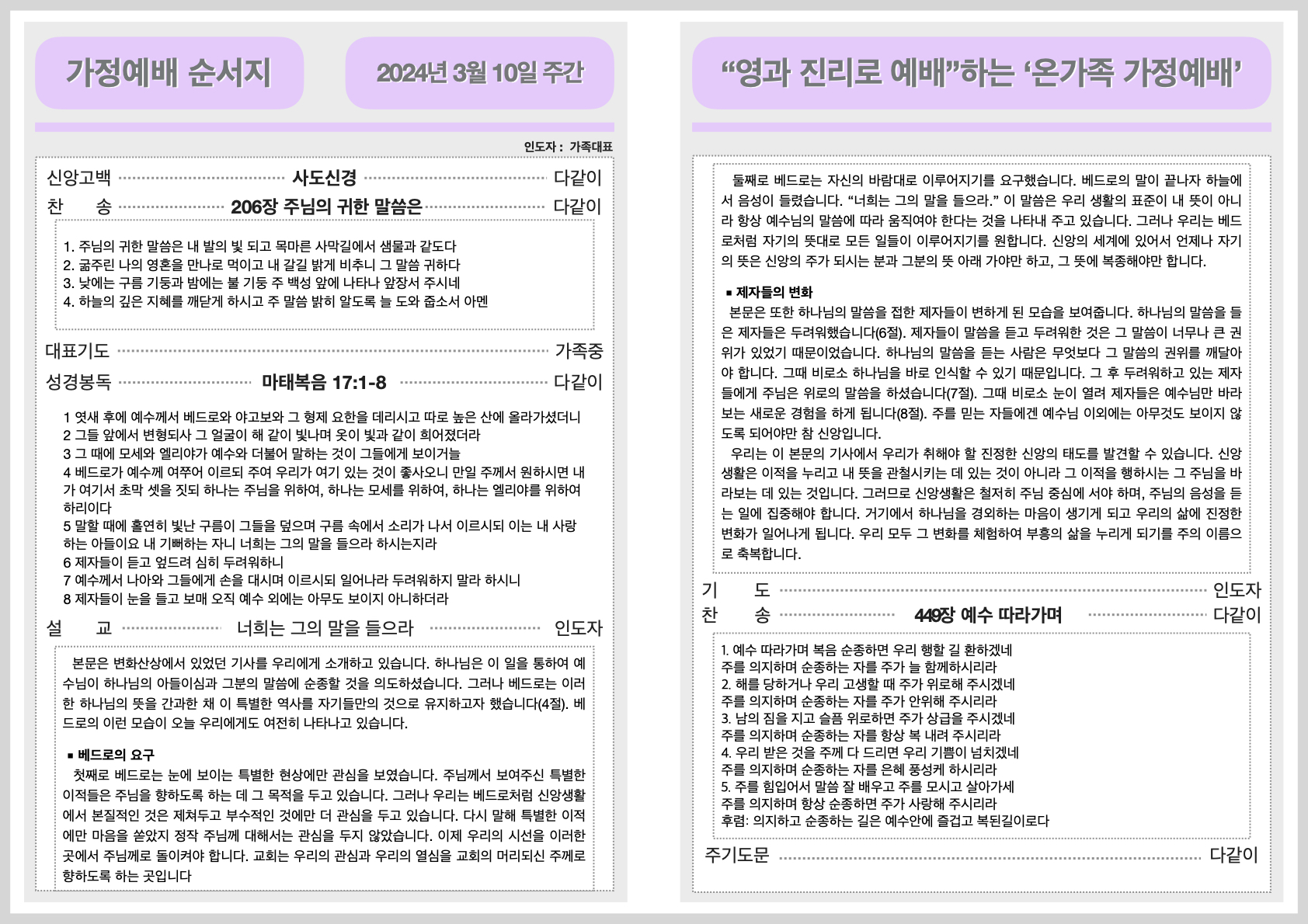 2024년 3월 10일 가정예배 순서지