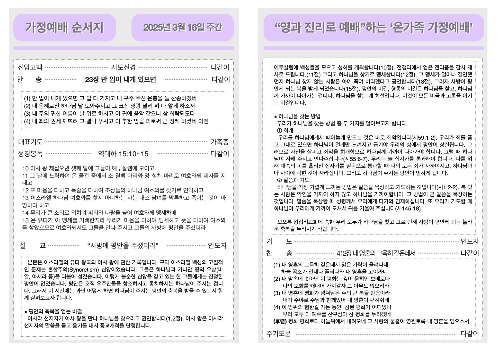 2025년 3월 16일 가정예배 순서지