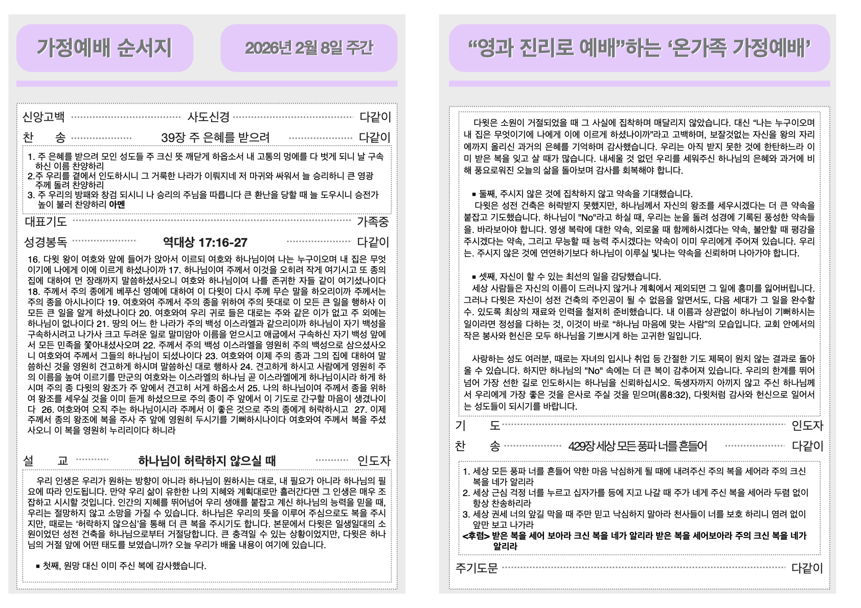 2026년 2월 8일 가정예배순서지
