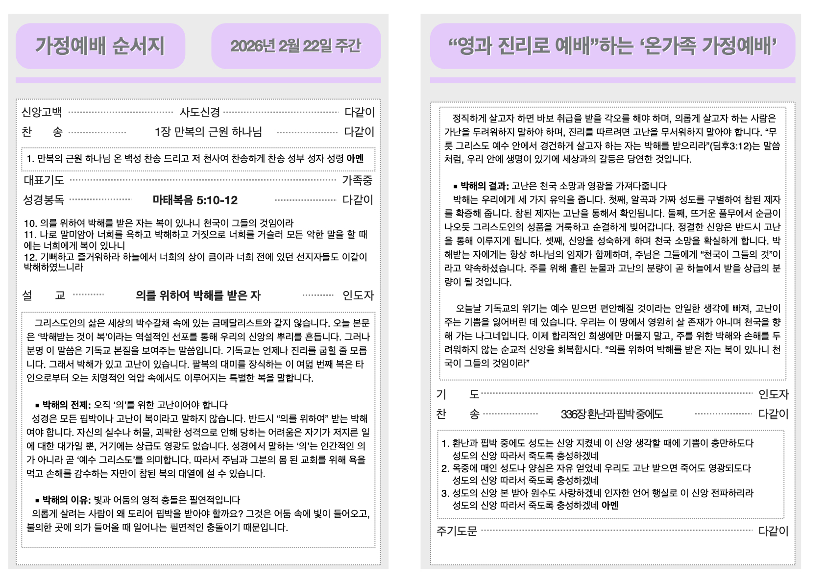 2026년 2월 22일 가정예배순서지