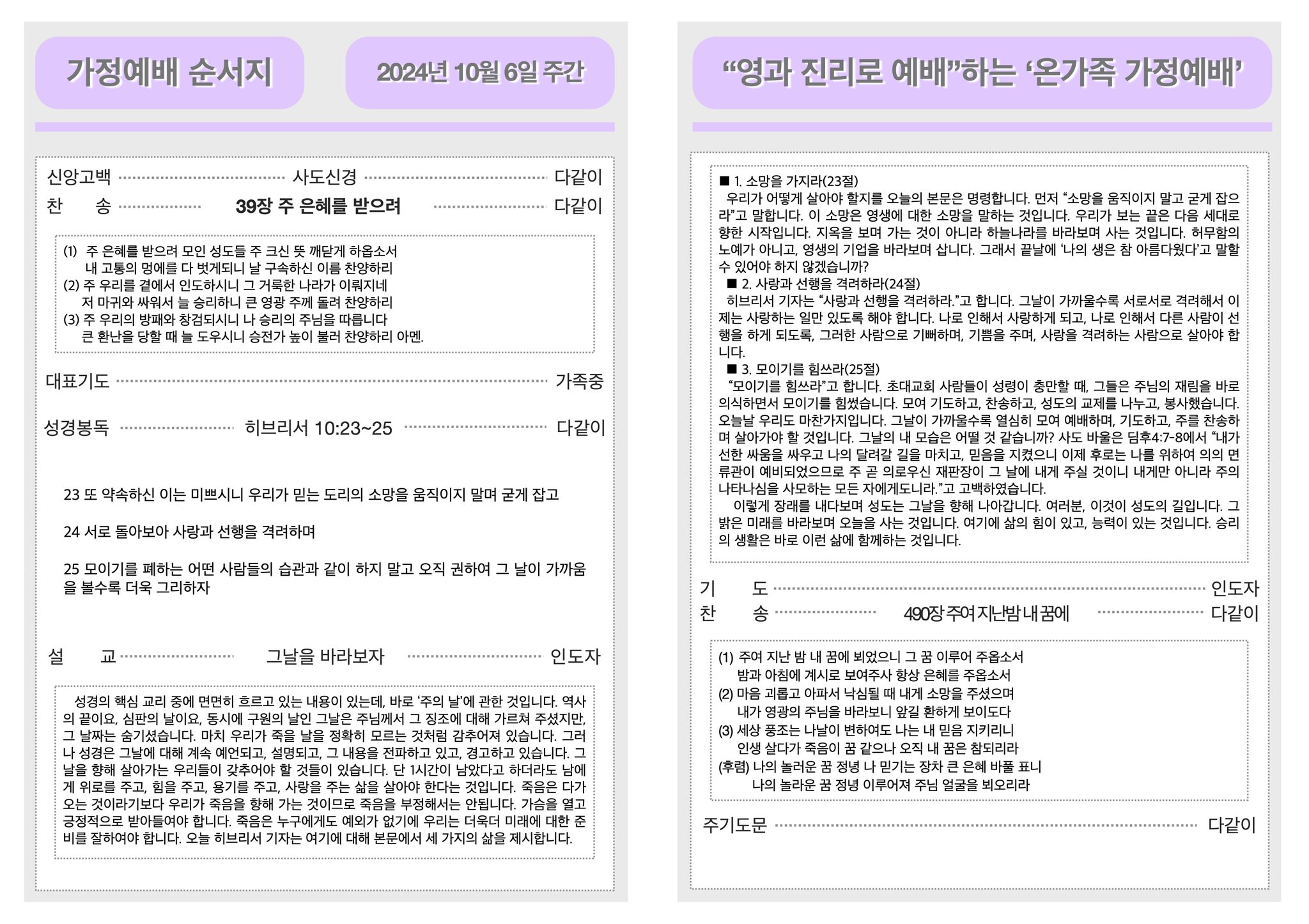 2024년 10월 6일 가정예배순서지