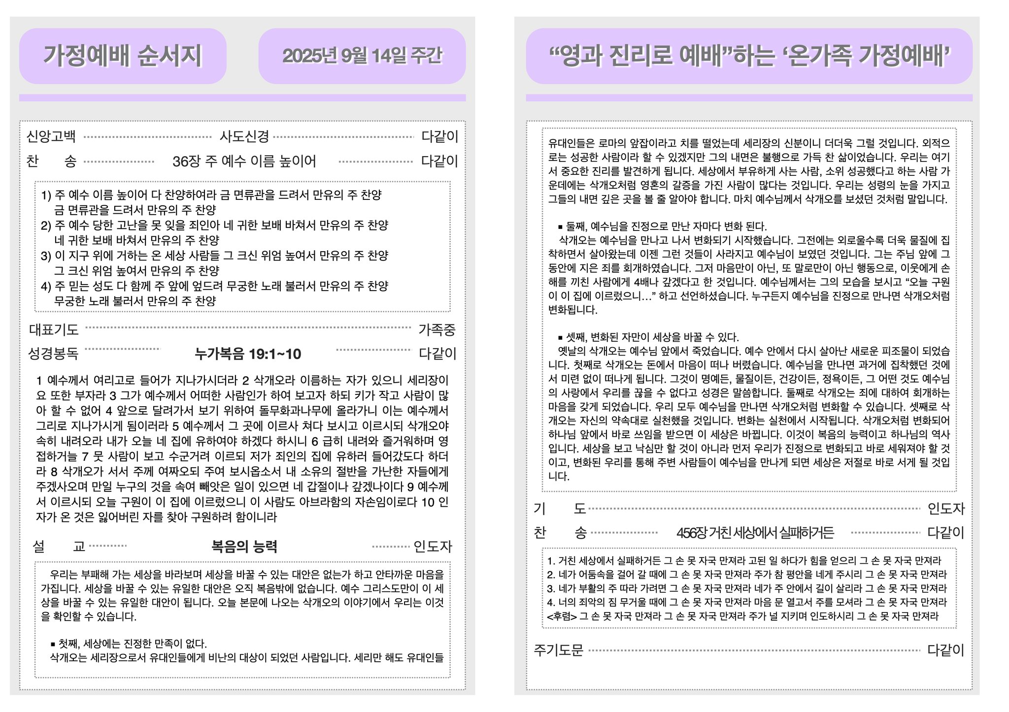 2025년 9월 14일 가정예배순서지