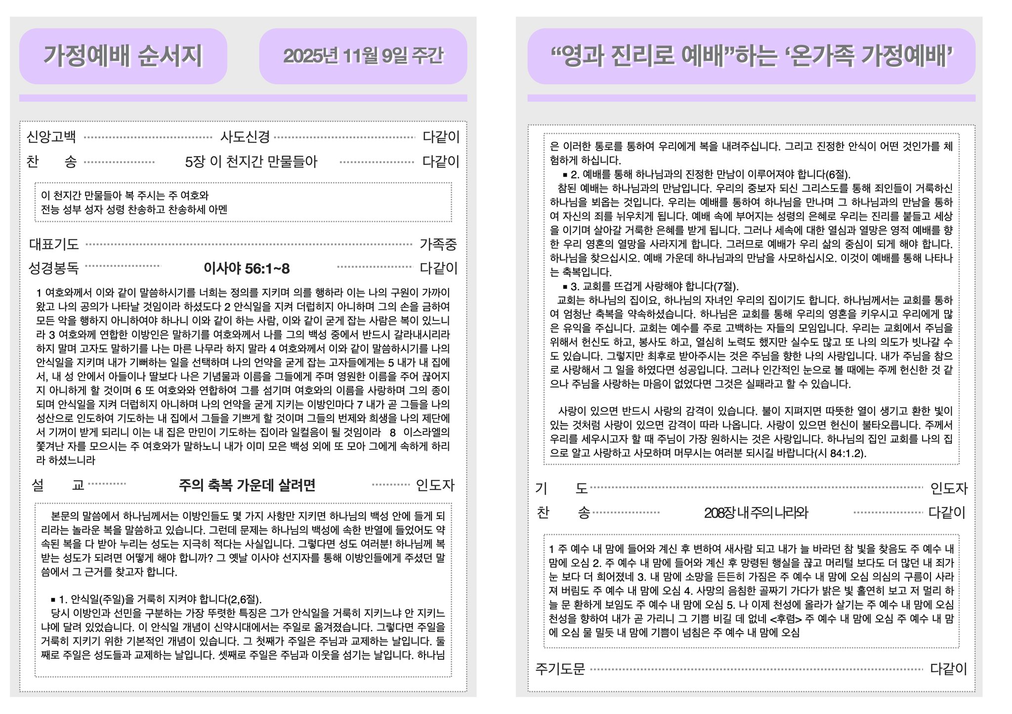 2025년 11월 9일 가정예배순서지