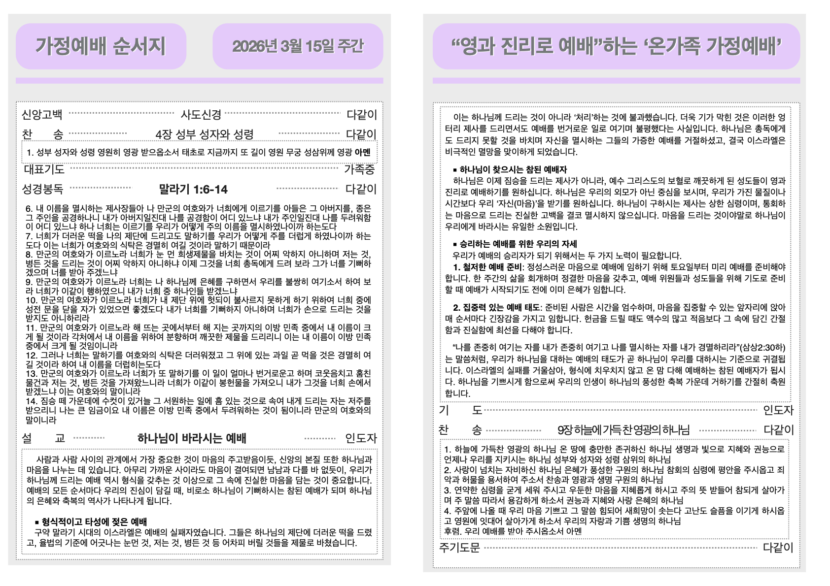 2026년 3월 15일 가정예배순서지