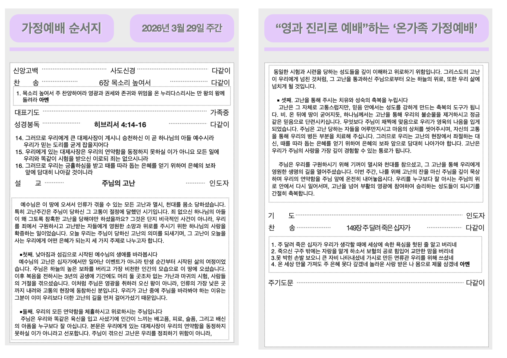 2026년 3월 29일 가정예배순서지